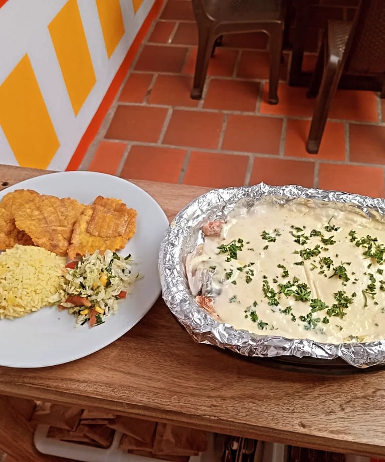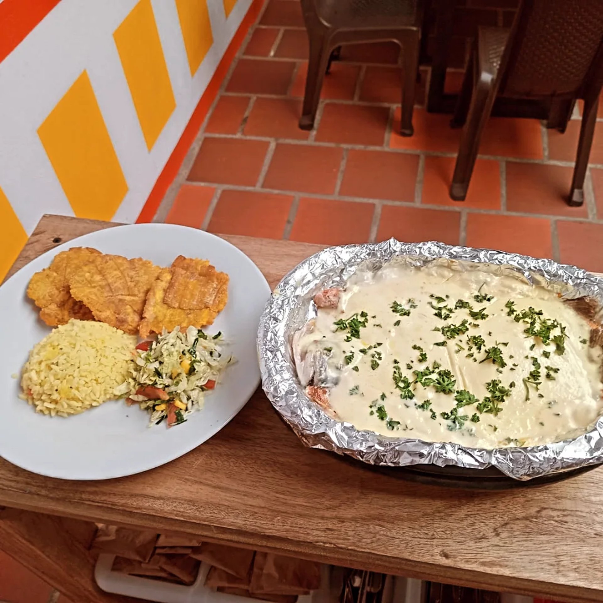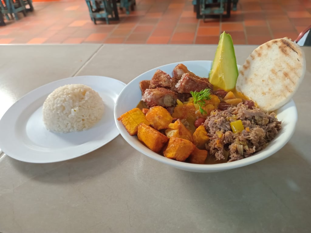 Estos platos se sirven acompañados de arepa, papa al vapor, maduro y ensalada, creando una comida completa y balanceada.